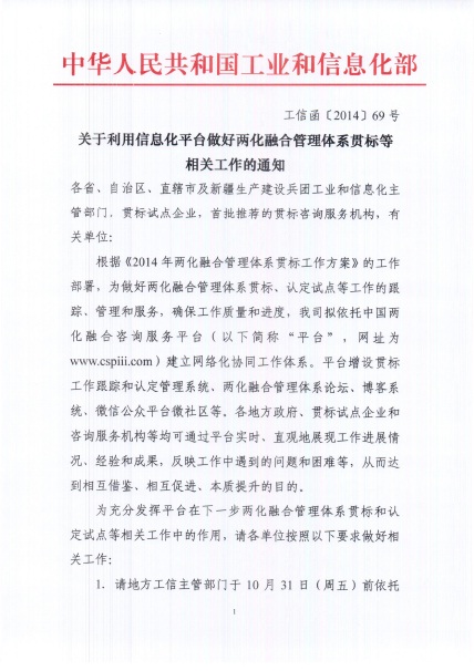 關(guān)于利用信息化平臺(tái)做好兩化融合管理體系貫標(biāo)等相關(guān)工作的通知(工信函[2014] 69號(hào))